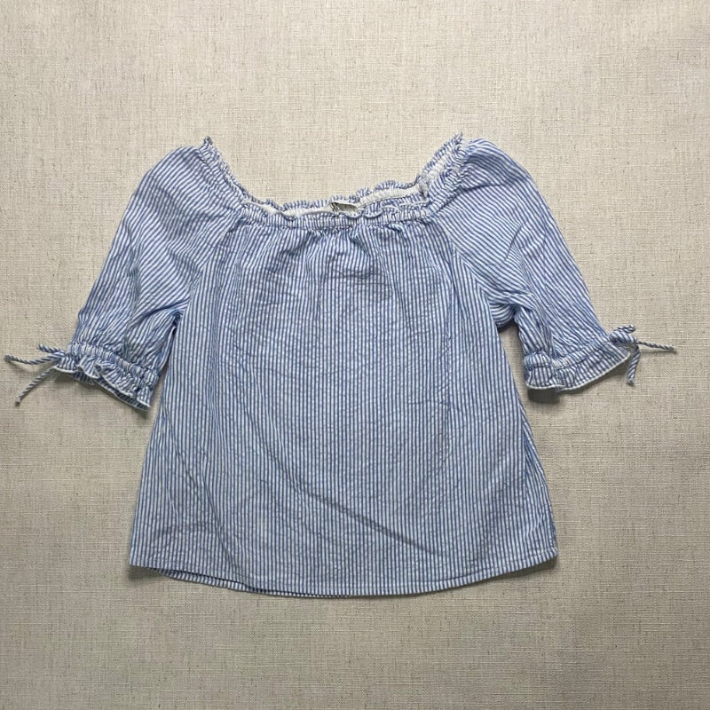 Blouse in cotton seersucker with a square neckline with elastic, and a frill trim and short, elasticated, frill-trimmed sleeves with a decorative bow.