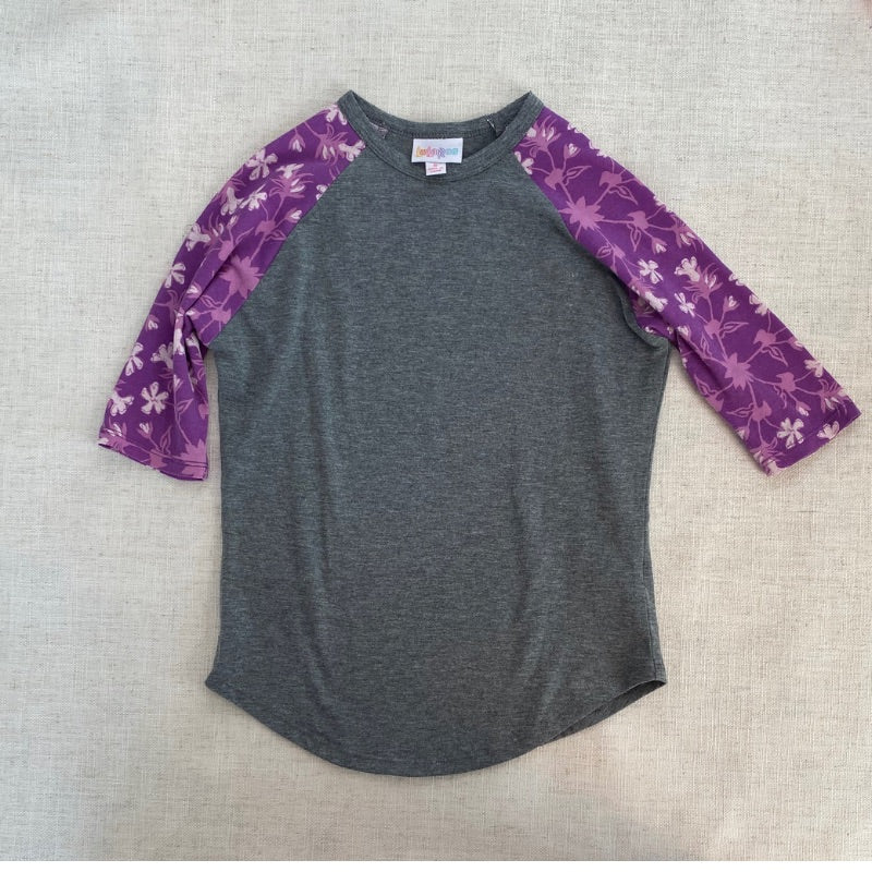 "Add a playful pop of color with the Lularoe Tee in grey and purple, perfect for any girl's wardrobe. Comfort meets style in this fun and quirky top!"